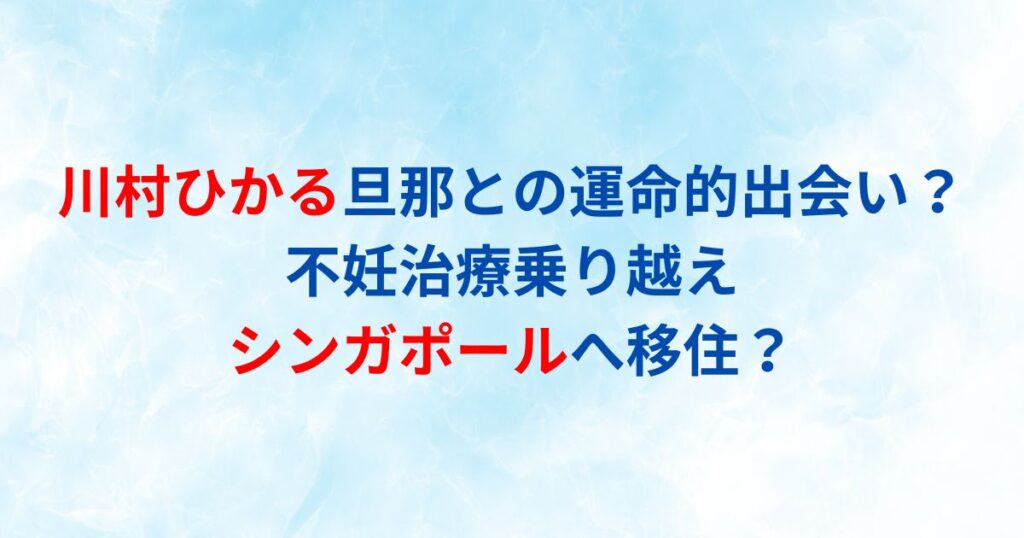 川村ひかるさんと旦那さんの物語は、多くの人々の心を打つ感動的なストーリーです。 運命的な出会いから始まり、不妊治療という困難を乗り越え、念願の家族を築き上げ、そして新たな挑戦としてシンガポールへ移住するまで、二人の歩みは多くの人に勇気と希... -