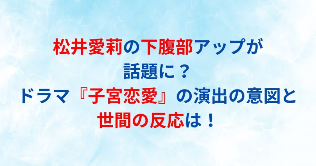 2025年に放送されたドラマ『子宮恋愛』で、松井愛莉さんの下腹部アップの演出が大きな話題となりました。 この演出は一体どのような意図で使われたのでしょうか? また、視聴者からはどのような反応があったのでしょうか? 今回は、松井愛莉さんの下腹部ア... -