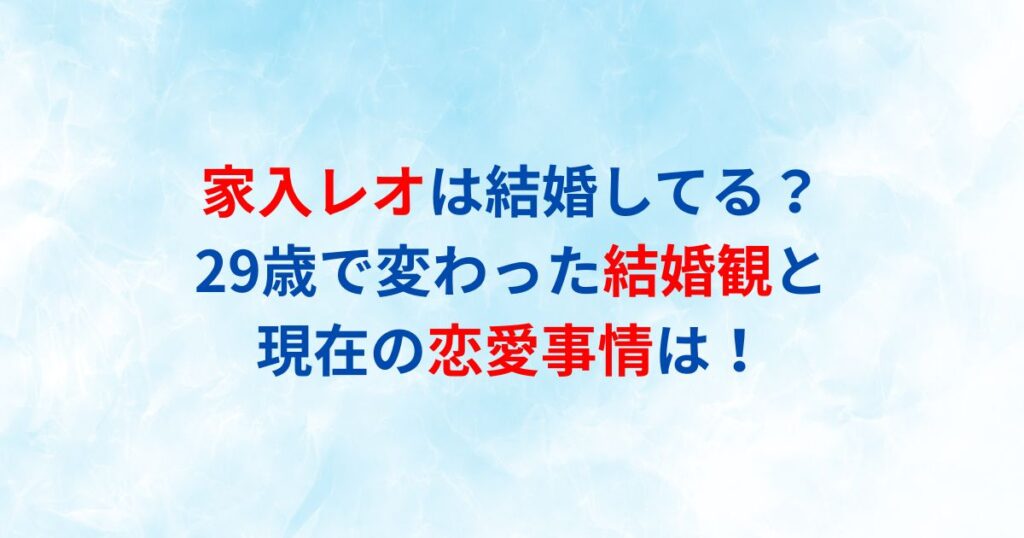 家入レオさんが結婚しているのか気になっている方も多いのではないでしょうか? シンガーソングライターとして活躍する家入レオさんは、2024年に29歳を迎え、結婚観に大きな変化があったことを明かしています。 この記事では、家入レオさんの結婚の真相や現... -