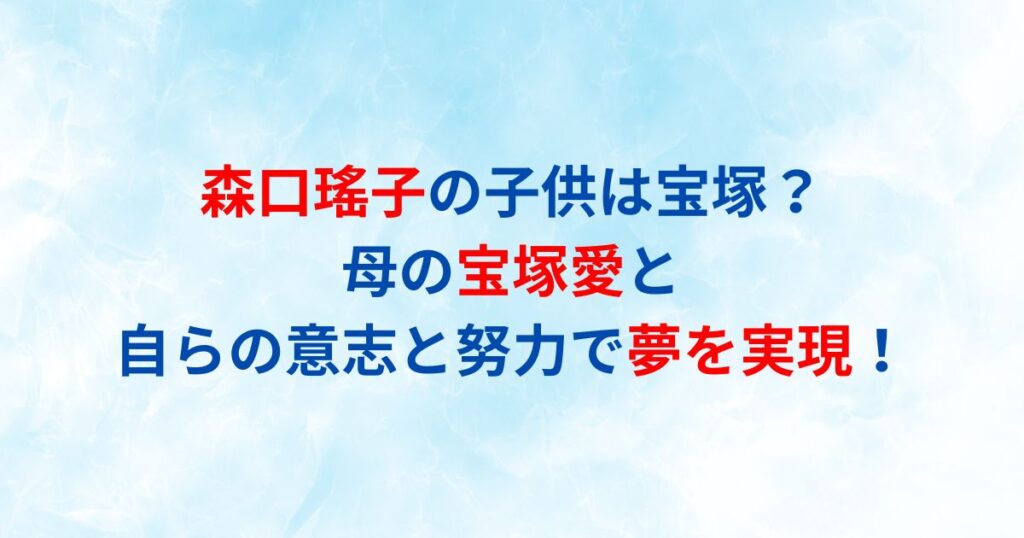 女優として長年活躍されている森口瑤子さん。 そんな森口瑤子さんの子供について気になっている方も多いのではないでしょうか? 実は森口瑤子さんの娘さんは、宝塚歌劇団で活躍されているんです! この記事では、森口瑤子さんの子供について、宝塚歌劇団で...