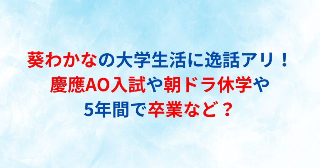 女優として活躍中の葵わかなさん。その輝かしい経歴の中で、大学生活はどのようなものだったのでしょうか? 今回は、葵わかなさんの慶應義塾大学での学生生活について、入学から卒業(仮定)までの興味深いエピソードをご紹介します。 AO入試での合格、朝... -
