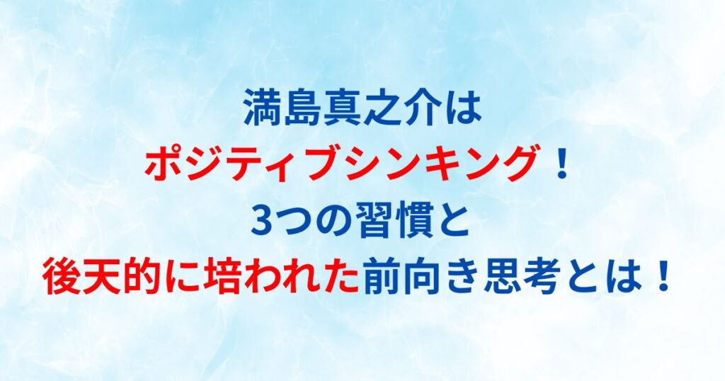 俳優として活躍する満島真之介さん。 その明るい性格と前向きな姿勢は、多くの人々を魅了しています。 しかし、彼のポジティブシンキングは生まれながらのものではありません。 厳しい家庭環境や様々な経験を通じて、後天的に培われたものなのです。 今回... -